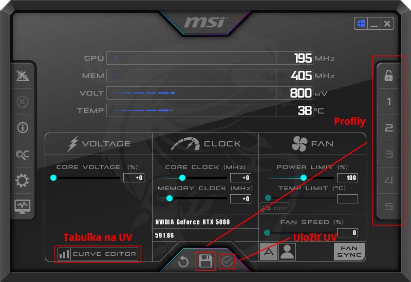 V prípade ak chceme undervoltovať bez straty výkonu, 2805MHz sme nechali a napätie sme na začiatku vyskúšali znížiť na 0.9V, čo bolo stabilné. Konkrétny nižší bod napätia si vždy označte klikom myši a následne podržte SHIFT a pohybom hore posuňte krivku na požadovanú frekvenciu, následne stlačte CTRL + L, čím uzamknete danú frekvenciu a napätie. Potom pod krivkou, kde smeruje dole žltá prerušovaná čiara, na ňu stlačte, držte SHIFT a pohybom myšou napravo označte všetky profily až úplne napravo. Potom znova stlačte a podržte SHIFT a 2x po sebe stlačte ENTER, čím vyrovnáte líniu profilov, aby vám korektne držalo požadované hodnoty. Výsledné nastavenie uložíte v MSI Afterburneri s APPLY a môžete testovať hru. Jednotlivé profily si viete aj pre uľahčenie napravo od 1-5 v tvare diskety uložiť.